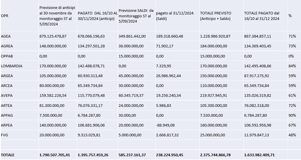 L’organismo pagatore lombardo, al 31 dicembre, aveva erogato l’84% dei contributi di sua competenza (142.495.406,66 euro sui 170.000.000 erogabili al massimo in acconto), staccando Emilia Romagna (73% di contributi erogati), Toscana (72%) e la stessa Agea (71%). Tutte le altre regioni restano più indietro. Meglio della Lombardia ha fatto soltanto l’organismo pagatore della provincia autonoma di Trento, che ha già versato il 90% degli anticipi, ma deve gestire un numero di domande e somme molto inferiori (7,5 milioni di euro).
