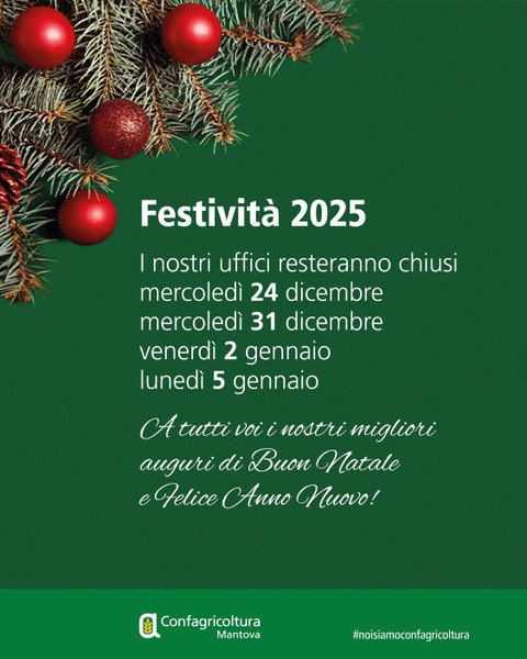comunichiamo che durante le Feste di Natale e Capodanno 2025-2026, la nostra sede centrale di Mantova e gli Uffici di Zona resteranno chiusi, oltre alle giornate festive, nei seguenti giorni: