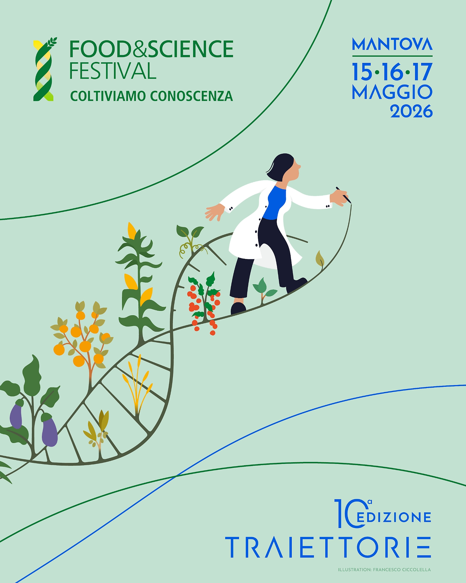 In fisica, la traiettoria descrive il percorso di un corpo nello spazio e nel tempo. Applicata all’agricoltura, questa immagine diventa una chiave di lettura per comprendere come innovazioni scientifiche, transizioni ambientali, nuovi equilibri geopolitici e trasformazioni dei modelli di consumo stiano orientando le scelte di produzione, distribuzione e alimentazione. A dieci anni dalla sua nascita, il Food&Science Festival celebra il percorso compiuto e rilancia la propria missione: essere uno spazio di analisi, confronto e divulgazione capace di leggere il cambiamento mentre accade. Il visual di questa speciale edizione, firmato dall’illustratore Francesco Ciccolella, raffigura una ricercatrice in cammino su una doppia elica che germoglia in colture e piante, evocando il dialogo continuo tra conoscenza scientifica, agricoltura e trasformazione del mondo contemporaneo.